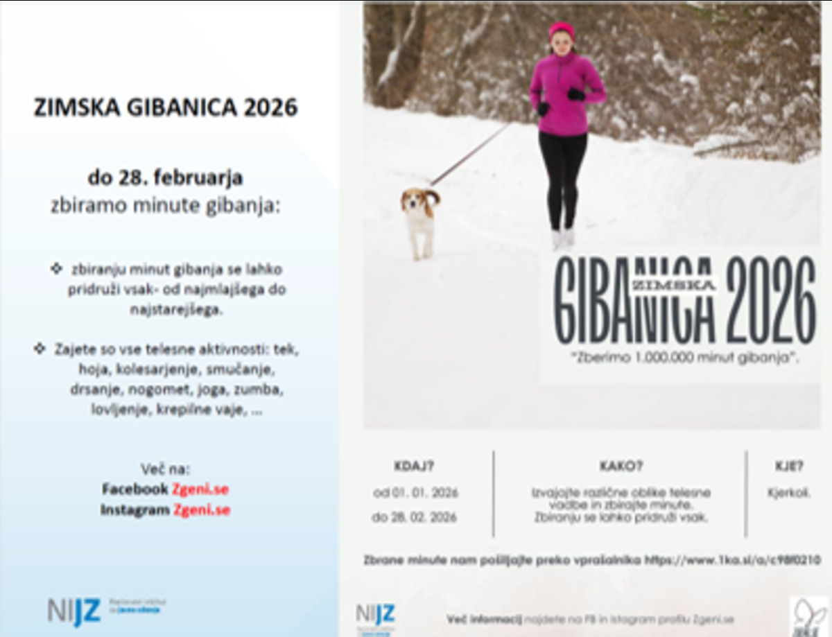 Priljubljena akcija Zimska gibanica, ki v Pomurju in tudi širše spodbuja gibanje že od leta 2021. V vseh teh letih je povezala širok krog ljudi, ki verjamejo v moč vsakodnevne telesne aktivnosti. Tudi letos vas prijazno vabimo, da se nam pridružite in skupaj dosežemo nov izziv – zbrati 1.000.000 minut gibanja Akcija temelji na preprosti ideji: vsak prispeva svoje minute gibanja, skupaj pa ustvarimo velik premik. Redna telesna dejavnost izboljšuje zdravje, počutje in kakovost življenja, zato želimo, da postane gibanje del vaše osebne novoletne zaobljube, ki jo tokrat uresničimo kot skupnost.